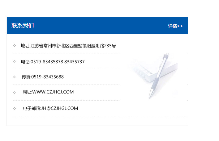 傳真:0519-83435688    郵編:213135    網址:WWW.czjhgj_com.hnpwgl.com    電子郵箱:JH@czjhgj_com.hnpwgl.com